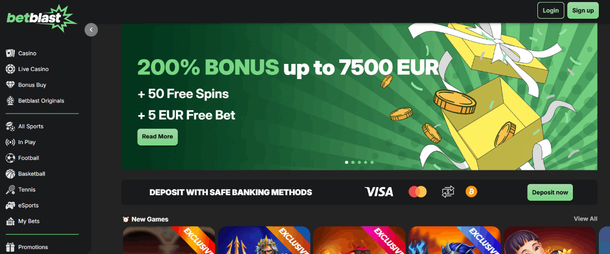 Betblast Casino — це сучасна криптоплатформа, яка об’єднує ставки на спорт і казино в одному зручному рішенні. Гравці отримують щедрий вітальний бонус до €7500, 50 фріспінів і €5 безкоштовної ставки — ідеально як для фанатів слотів, так і для беттерів.