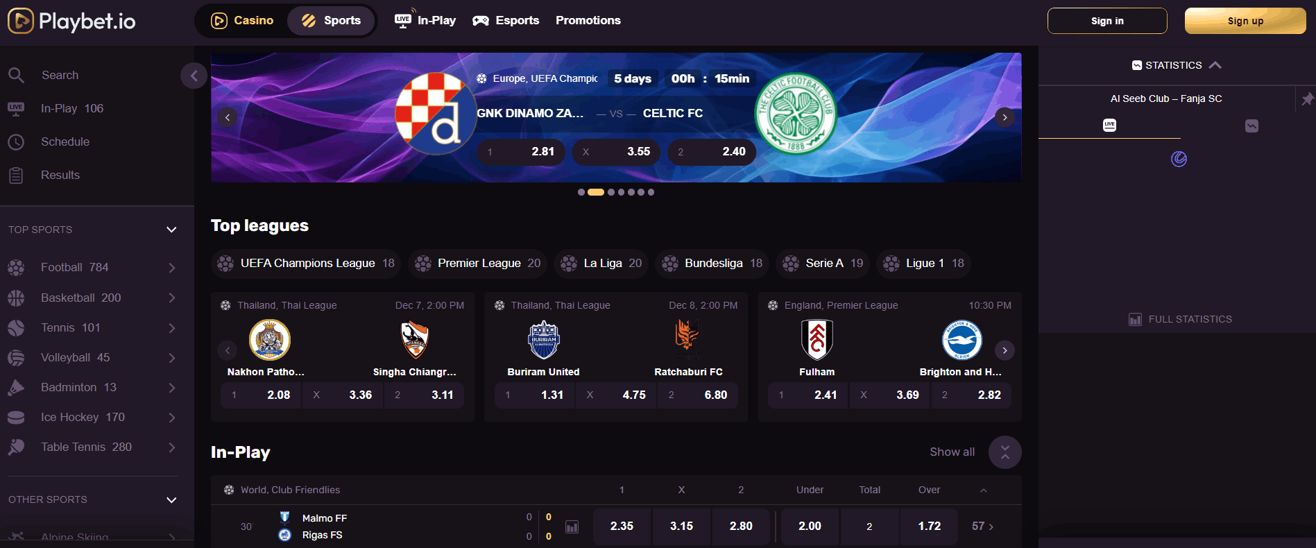 Playbet.io – це платформа, яка пропонує величезний вибір ставок на спортивні події для гравців із різними інтересами. На сайті представлені найпопулярніші види спорту, включаючи футбол, баскетбол, теніс, волейбол і хокей, а також менш поширені дисципліни, такі як настільний теніс чи бадмінтон. Усі події супроводжуються зручним інтерфейсом, який дозволяє швидко знаходити потрібні матчі та робити ставки.