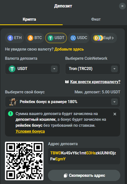 С криптовалютой всё проще. JB поддерживает более 30 монет, включая Bitcoin, Ethereum, USDT и Solana. Минимальный депозит начинается от 5 USDT, ограничений на вывод нет. Кроме того, сохраняется анонимность – верификация для криптовалютных операций не обязательна.